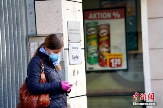 4月20日下午,一位戴口罩和手套的女子站在柏林一家超市门前。近日来,柏林佩戴口罩者逐渐增多。中新社记者 彭大伟 摄