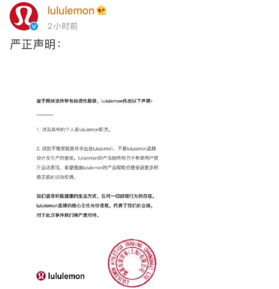今天(21日)中午,露露乐蒙贸易(上海)有限公司在官方微博@Lululemon对“网传带有歧视性服装”作出严正声明。声明称,涉及其中的个人非Lululemon职员,该款不雅服装并非出自Lululemon,不是Lululemon品牌设计及生产的服装。↓