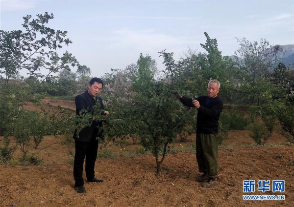 4月19日,河南三门峡市渑池县南村乡西山底村贫困户张希(右)和驻村干部张华国一起查看花椒长势。 新华社发