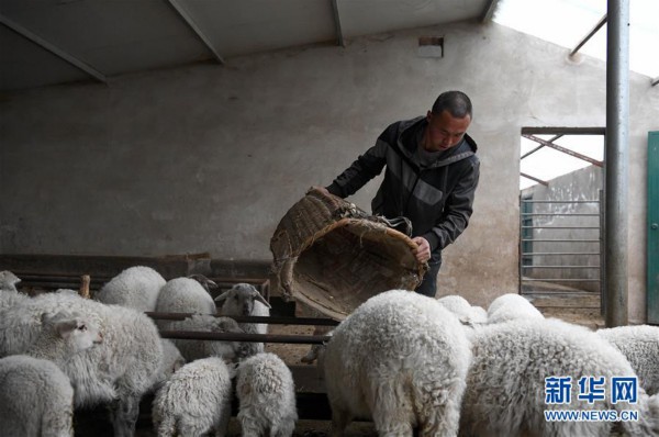 在宁夏西海固,金素素在出发去福建前给家里的羊添加草料(2月26日摄)。 新华社记者 冯开华 摄