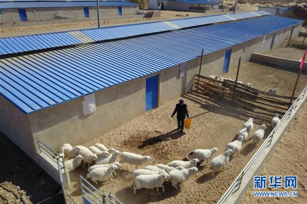 在甘肃省武威市古浪县黄花滩生态移民区富民新村,李应川在喂羊(无人机照片,3月10日摄)。 新华社记者 范培珅 摄