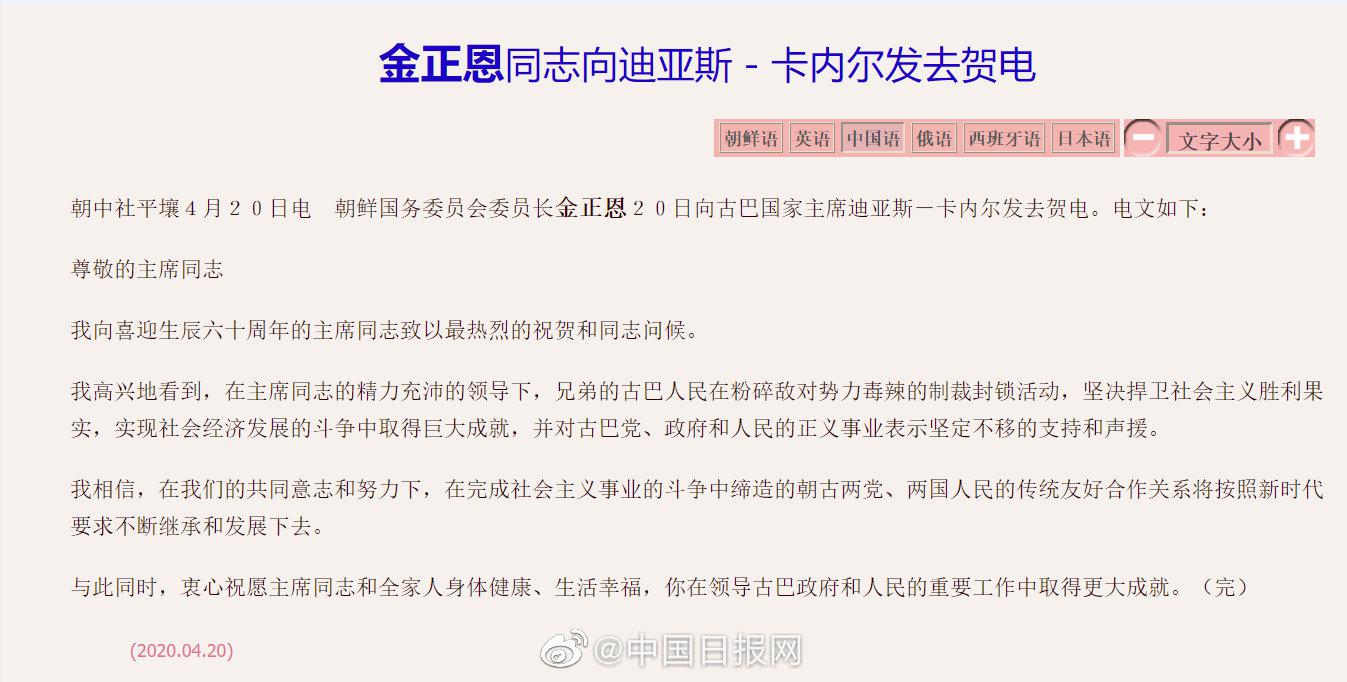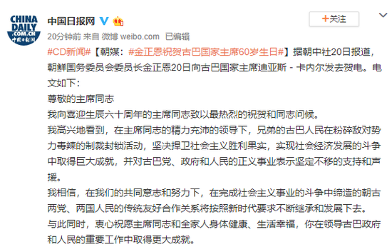 据朝中社20日报道,朝鲜国务委员会委员长金正恩20日向古巴国家主席迪亚斯-卡内尔发去贺电。电文如下: