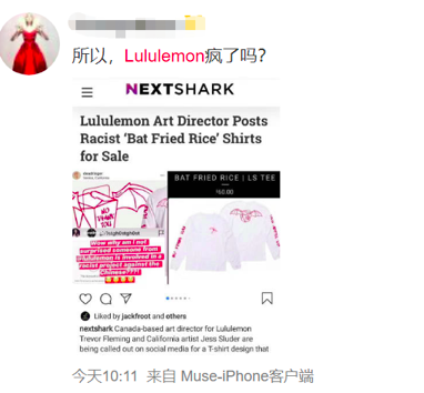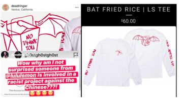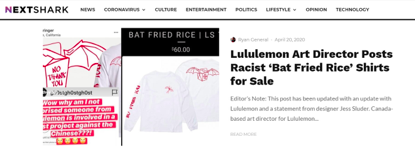美国“Nextshark”网站:Lululemon艺术总监发帖出售带有种族歧视色彩的“蝙蝠炒饭”T恤