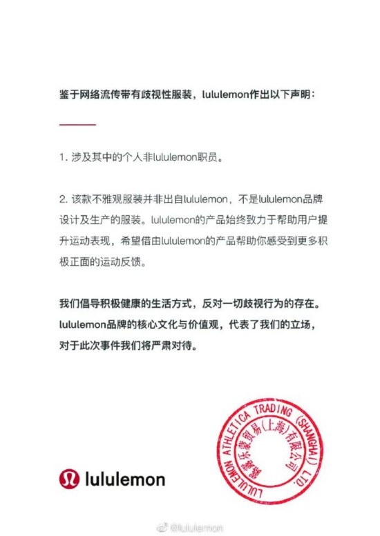 今天(21日)中午,露露乐蒙贸易(上海)有限公司在官方微博@Lululemon对“网传带有歧视性服装”作出严正声明。