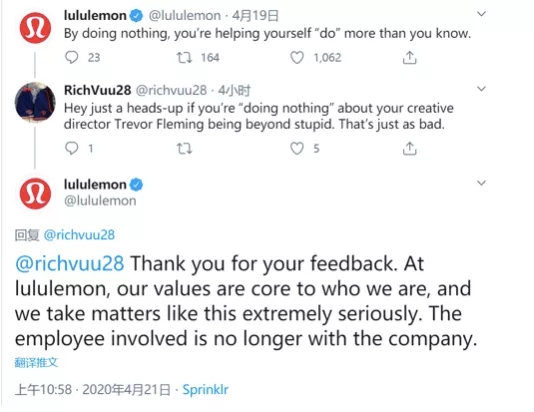 在Lululemon19日的一条推文下,有网友评论称,“嘿,提醒你一下,如果你对你的创意总监特雷弗·弗莱明愚蠢到极点的行为‘什么都不做’的话。那也一样糟糕。”