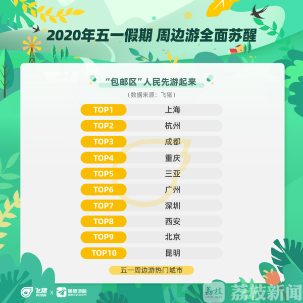 五一加快了国内旅行市场复苏的脚步,城市周边游全面苏醒。数据显示,包邮区人民首先玩了起来,上海与杭州排在五一周边游热门城市前列,爱吃爱玩的成都和重庆人也是五一出游主力。