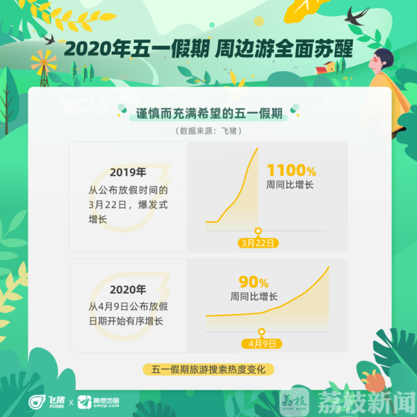 与去年不同,今年的五一有点慢热。去年的3月22日,国务院发布五一放4天假的通知,当天,相关平台上的五一旅游产品的搜索瞬间爆发,周同比增幅达1100%。而今年,受疫情防控形势影响,五一的搜索热度直到4月9日才开始逐步走高,但周增幅依然达90%以上,是一个谨慎而充满希望的五一假期。