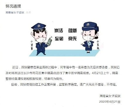 近日,我狱警察在乘坐高铁过程中,同车厢中有一名乘客为无症状感染者,我狱已及时将其送往长沙市雨花区集中隔离点进行了集中医学隔离观察。4月21日上午,隔离警察经血清检测和核酸检测,结果均为阴性。