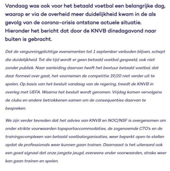 “荷兰足协目前还没有正式宣布取消荷甲2019-20赛季,这主要是因为荷兰足坛因为疫情目前面临着重大的财政危机,多方面都专注于努力做出尝试,以确保足球俱乐部能够在危机中存活下来。”