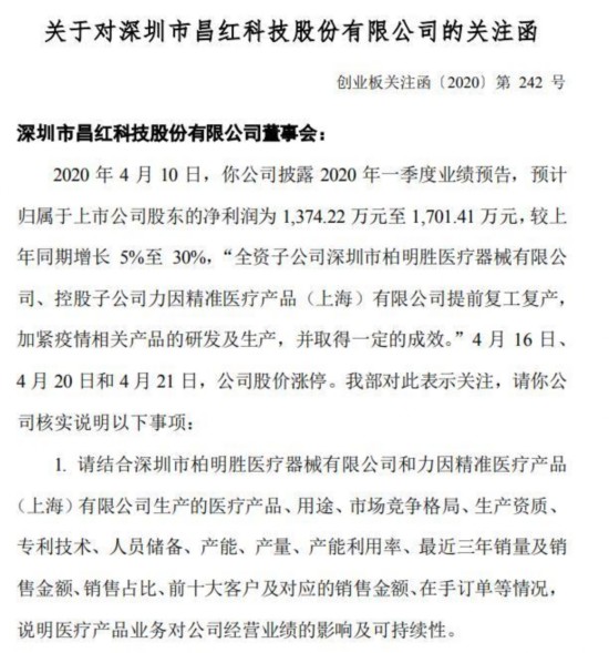 22日,昌红科技发布公告称,公司收到深交所关注函。4月16日、4月20日和4月21日,公司股价涨停,深交所要求说明公司是否存在主动迎合市场热点、炒作公司股价的情形。