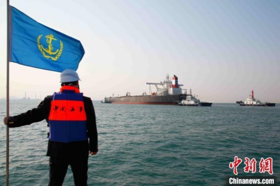 超大型油轮“优益”轮在青岛海事部门的护航下安全靠泊青岛港黄岛码头。马桂山 摄
