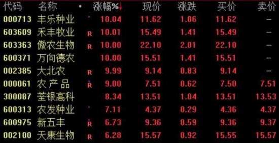 临近午间收盘,农业股出现异动,深粮控股、丰乐种业、万向德农拉升封板,金健米业、北大荒、京粮控股等跟涨。