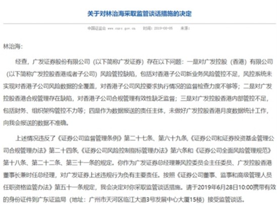 2019 年 6 月 19日,中国证监会出具了《关于对林治海采取监管谈话措施的决定》,证监会指出广发证券存在四大问题,包括对广发控股香港风险管控缺陷,对香港子公司新业务风险管控不足,风控系统未实现对香港子公司风险数据的全覆盖,对香港子公司风控要求执行情况的监督检查力度不够等。