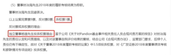 耐人寻味的是,在2019年4月16日,广发证券审议《关于董事2018年度履职考核的议案》时,对于林治海2018年履职考核表现,独立董事杨雄投了弃权票,理由是鉴于公司《关于对Pandion基金事件相关责任人员合规问责方案的报告》对林治海先生的责任认定和问责措施,以及对该董事自我评价结果的复核,结合公司《合规问责办法》、监管部门要求,后续个人责任仍有不确定性。