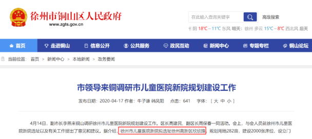 2018年2月,徐州市儿童医院官网透露,2017年新获得市委市政府分院建设用地批准。