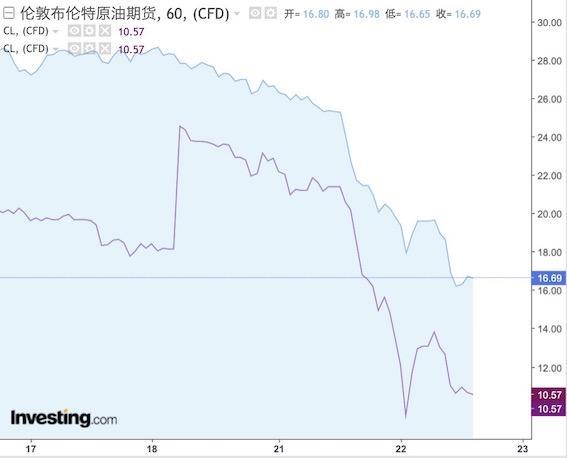 KVB PRIME分析师魏巍(Colin Wei)对记者表示,“继周一油价崩盘、5月WTI原油期货合约跌至负值域后,21日原油市场崩溃势头持续扩大,6月WTI原油期货合约一度下跌68%至每桶6.5美元。该并非由于期货合约即将到期,反映出石油市场情势严峻,美油收盘时录得跌幅达35.43%,报7.69美元/桶。布伦特原油亦下跌23.94%至18.74。”