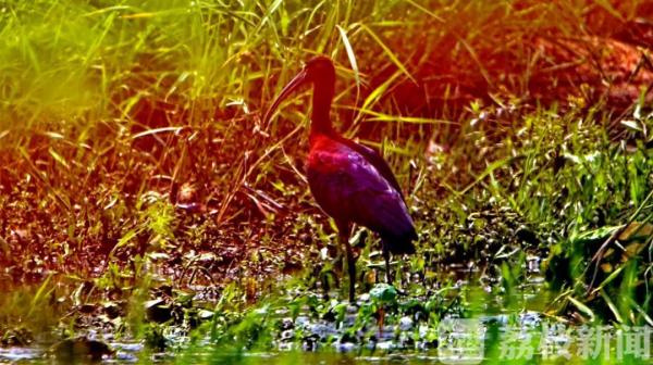 近日,泰州兴化鸟友姚建兴在千垛镇刘沟村拍鸟时,发现一只黑色的鸟。从照片上看,这只鸟嘴是淡黑色,特别长,脚是绿褐色,上体带有紫色光泽。经专业人士鉴定为彩鹮,这也是泰州境内首次拍到彩鹮。