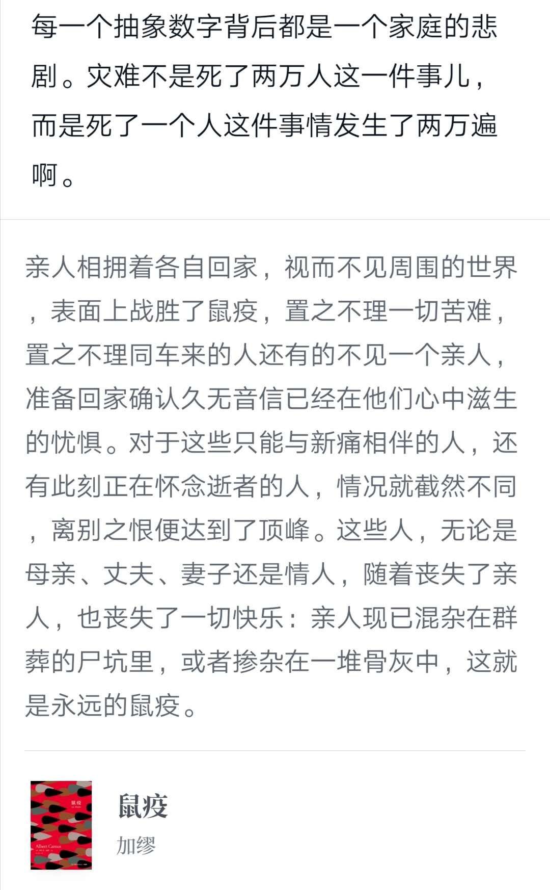 武汉封城、全国各地医护人员驰援抗“疫”,胖瓜翻出了加缪的《鼠疫》,这也讲了一个抗“疫”故事。书里有一段描述了奥兰解封后的情景,大部分人欢呼雀跃,与久别的亲人相拥,但与之形成强烈对比的是另外一部分因为鼠疫“丧失了亲人,也丧失了一切快乐”的人。