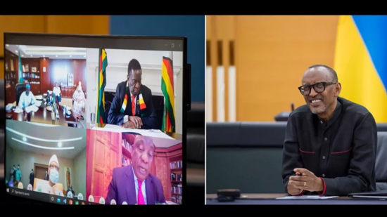 △卢旺达总统卡加梅(右)和非洲其他国家领导人召开视频会议(图片来源:卢旺达《新时代报》)