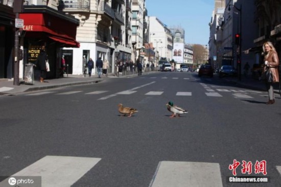 资料图:3月30日,法国巴黎,塞纳河里的野鸭上岸后跑到空荡荡的街道遛弯。图片来源:ICphoto