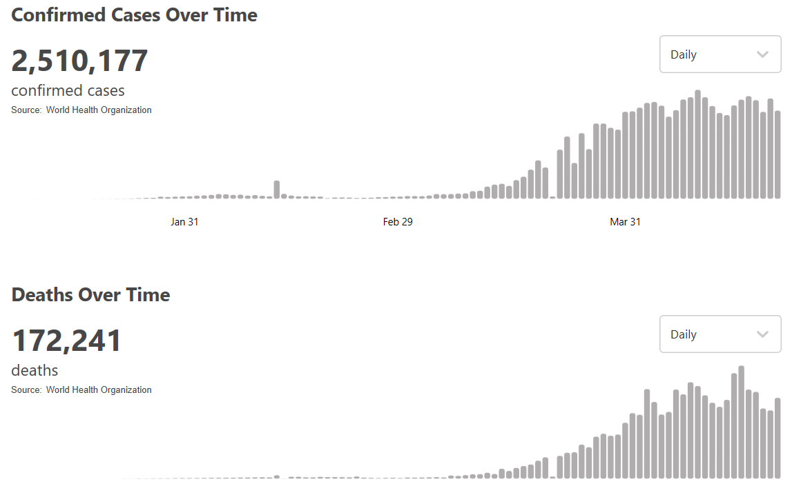 根据世卫组织最新统计数据,目前全球确诊新冠肺炎2510177例,死亡172241例,中国以外超过242万例。