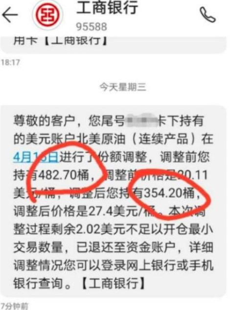 22日午间更有消息称,有部分通过中行“原油宝”产品抄底并持有至今的投资者,在此次油价暴跌事件中遭受重创。由于油价已跌至负值,做多客户已事实上全部爆仓。更有微博网友爆料,称已收到银行短信,不仅所有投资额都打了水漂,还被要求“倒赔银行3倍保证金”。
