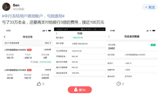 由于油价已跌至负值,做多客户已事实上全部爆仓。更有微博网友爆料,称已收到银行短信,不仅所有投资额都打了水漂,还被要求“倒赔银行3倍保证金”。
