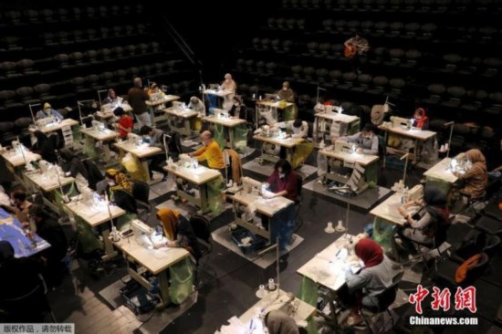 当地时间4月15日,伊朗德黑兰市中心的哈菲兹剧院大厅,一名吉他手给正在为抗击新冠肺炎疫情赶制口罩得志愿者们弹奏歌曲。