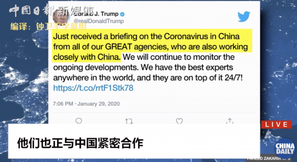 1月29日,特朗普发推文称,刚刚听完我们所有优秀的机构对中国新冠病毒的情况介绍,他们也正与中国紧密合作。
