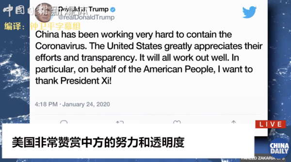 在1月24日这条推文里,特朗普高度赞赏了中国的抗疫行动: