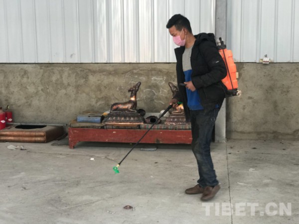 图为工作人员正在对厂房进行消杀 图片由普次仁提供