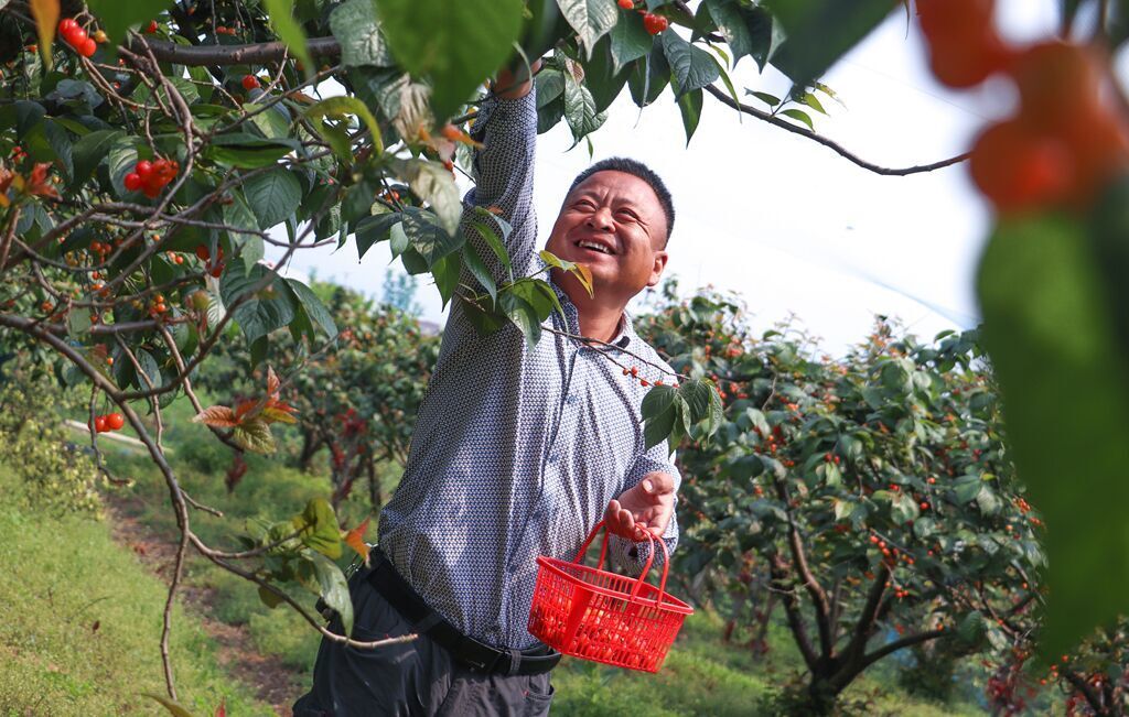 又到一年樱桃红,4月24日,江苏句容白兔镇一湾农耕生态园里的40亩樱桃已经陆续成熟。一串串晶莹剔透的果实挂满枝头,红彤彤、黄灿灿的樱桃,鲜艳欲滴,阵阵果香扑面而来,沁人心脾,果农们开始采摘收获红彤彤的樱桃。句容市一湾农耕生态园负责人朱忠民告诉记者:“虽然今年是樱桃产量小年,但是个头还是蛮大的,口味醇正,品质比去年好,4月26日将正式开园采摘。”