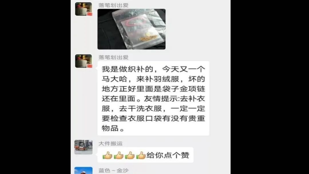 马彩平 织补女:上次有个顾客衣服里有4样,金项链、金耳环、还有吊坠,全都在衣服里,送来时都没有用袋子装着,就是捧在手里拿过来的,万一掉在路上了呢 ,以后不管去干洗店也好 ,去补衣服也好, 一定要检查自己的口袋是否有贵重物品。