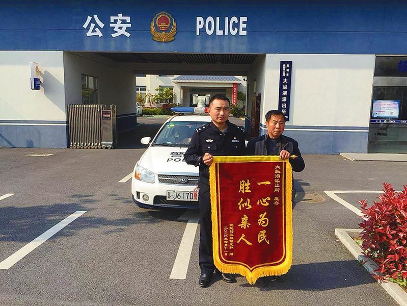 4月18日上午,盐都区大纵湖镇一村民胡某将一面印有“一心为民、胜似亲人”的锦旗送到盐都区公安局大纵湖派出所民警蒋超手中,感谢民警及时提供帮助,救助其叔叔。