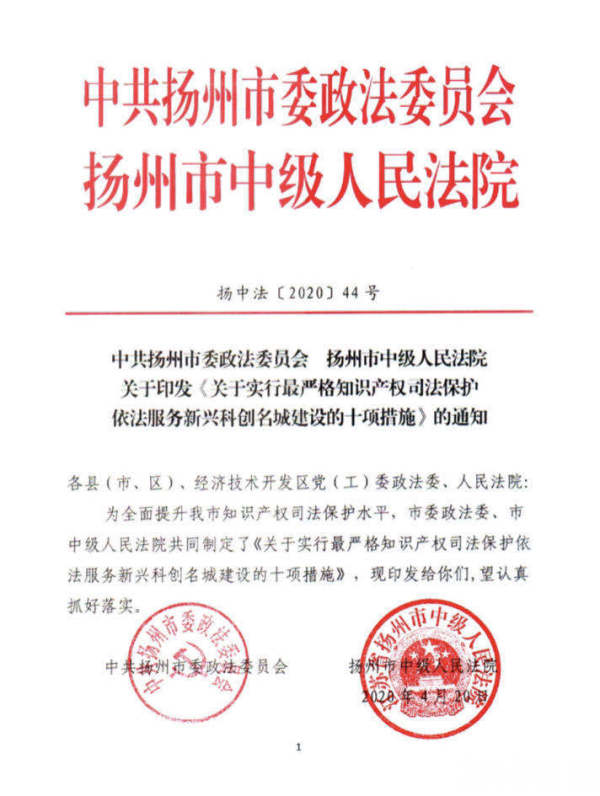 针对依法服务新兴科创名城建设,实行最严格的知识产权司法保护,发布会上,扬州中院提出了开展“知识产权法官进驻园区”、服务地方特色品牌建设、及时预警知识产权风险等十项措施。