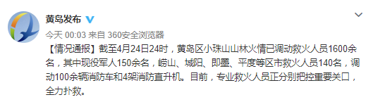 荔枝新闻讯 据黄岛发布消息, 截至4月24日24时,黄岛区小珠山山林火情已调动救火人员1600余名,其中现役军人150余名,崂山、城阳、即墨、平度等区市救火人员140名,调动100余辆消防车和4架消防直升机。目前,专业救火人员正分别把控重要关口,全力扑救。