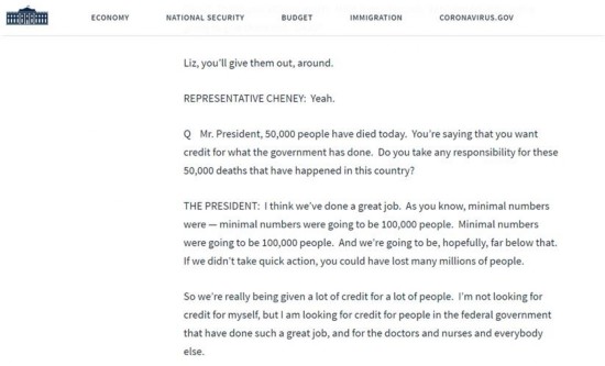 根据白宫24日发布的现场实录,在签署仪式的提问环节中,有记者就美国新冠肺炎死亡病例超5万人一事提问特朗普,“你会对我们国家5万人死亡一事负责吗?”
