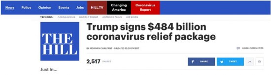 据美国《国会山报》报道,当地时间24日,特朗普在白宫椭圆形办公室签署4840亿美元纾困法案并发表讲话。