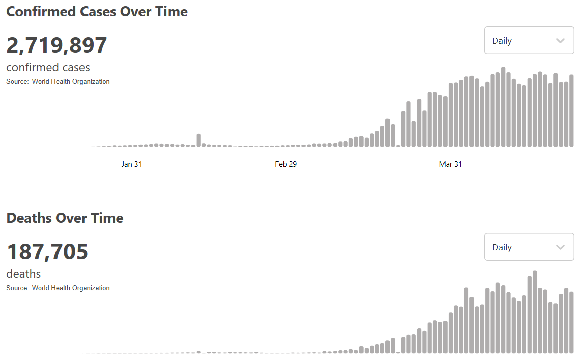 根据世卫组织最新实时统计数据,目前全球确诊新冠肺炎2719897例,死亡187705例,中国以外超过263万例。