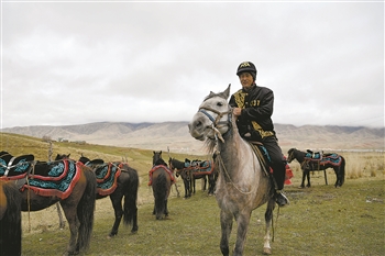 4月16日,新疆伊犁哈萨克自治州喀拉峻国际生态旅游区,一名马队骑手在演练,为迎接旅游旺季做准备。新华社 宋彦桦 摄