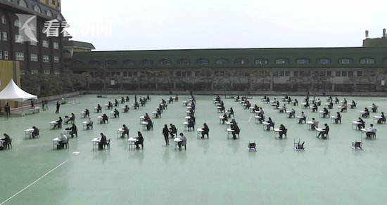 考场设在一个学校的露天操场上,所有考生进入考场时,必须先测量体温。在考试期间,考生和监考人员必须佩带口罩,座位之间保持至少1.5米的距离。