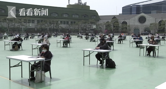 4月25日,为了防止新冠病毒传播,韩国保险从业人员在户外进行了一场资格考试。
