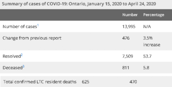 在安大略省,132个长期护理机构都出现了新冠肺炎疫情暴发的情况,这个数字占安大略省630个养老机构的五分之一。根据安大略省政府公布的数字,截止到4月25日,在养老机构里死亡的老人已经达到625人,这个人数占该省新冠累计死亡病例811个的77%。这个比例比欧洲的数字高得多。