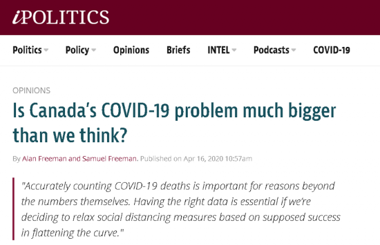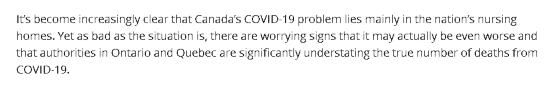 阿兰·弗里曼和萨缪尔·弗里曼在题为《加拿大的新冠肺炎疫情问题是否比我们以为的更严重?》的文章里说,“情况越来越明显,加拿大新冠肺炎疫情最严重的地方是护理机构。与这个情况同样严重的是,安大略省和魁北克省政府开始明白,这些机构的死亡数字实际上可能更高。”