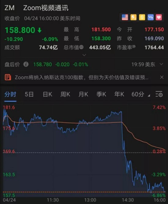 这意味着,不到两个小时时间,Zoom市值就蒸发约58.87亿美元(约合416亿元人民币)。