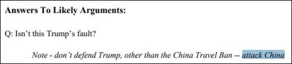 除此以外,备忘录里的一句话很有意思:“除了提及之前对中国实施的旅行禁令,不要为特朗普辩护——攻击中国就行。”