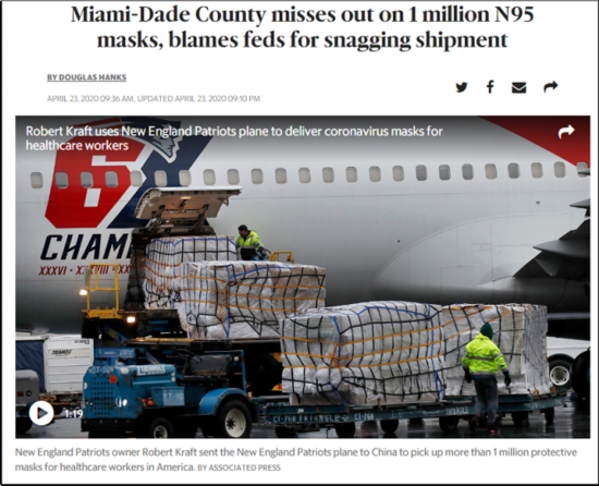 △《迈阿密先驱报》报道了迈阿密戴德县订购的100万枚N95口罩被联邦政府中途截走