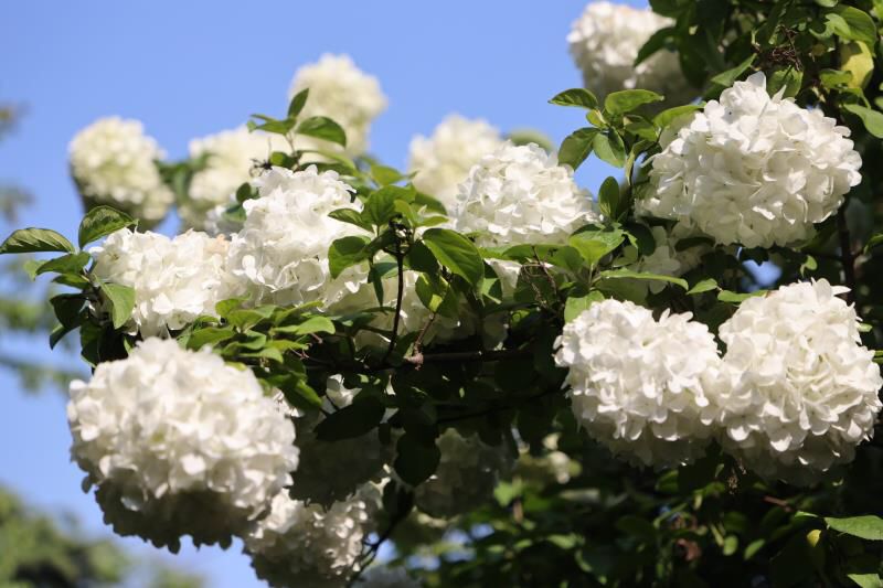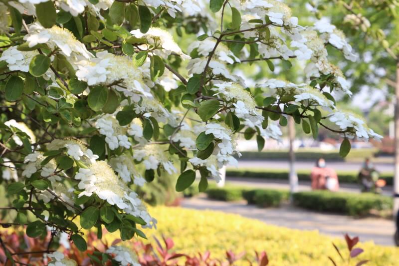 昆仑大道上的白绣球,点缀着绿色枝叶,淡雅素净;