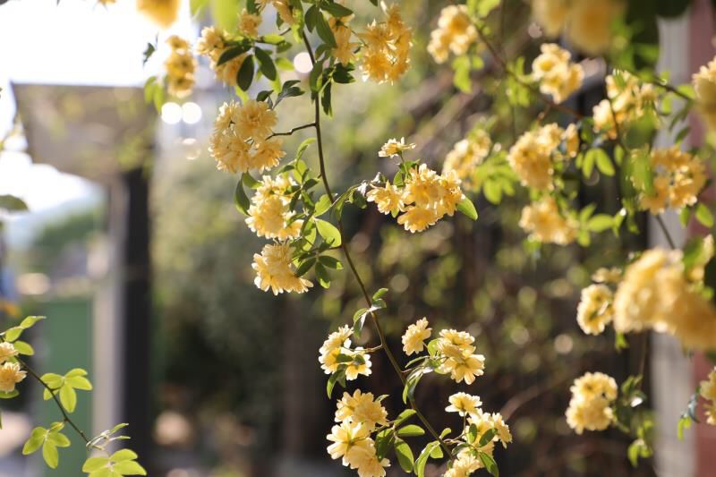 凤台路,一家院落围墙垂落的黄色木香花