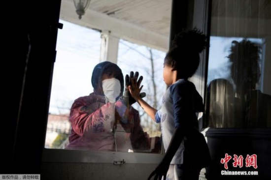 当地时间4月11日,美国纽约州新冠疫情持续严峻,新罗谢尔市的医疗行业从业人员哈希姆在工作期间与家人保持“社交距离”,和女儿隔门相会击掌。